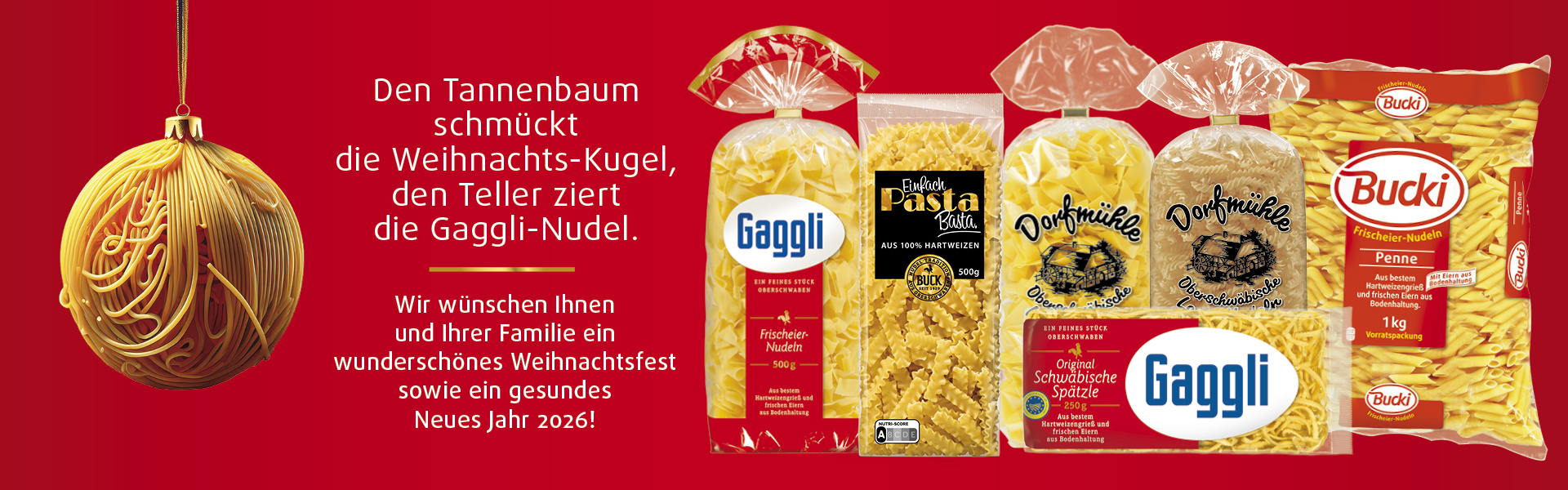Den Tannenbaum schmückt die Weihnachts-Kugel, den Teller ziert die Gaggli-Nudel. Unsere Nudelgeschenke.